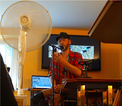 Es hätte die Möglichkeit gegeben, "oben" am Mikro zu stehen - dort hätte ich mich aber so gut wie nicht bewegen können. Die andere Möglichkeit, etwas weiter unten, brachte dann unter anderem mit sich, dass öfter einmal Menschen an mir vorbei schlängelten, sowohl von den rezdays, als auch von den Lokal - Bediensteten.